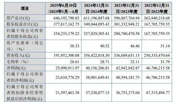 2022年至2024年及2025年上半年(下称“报告期”),吉宝股份营业收入分别为2.5亿元、3.37亿元、3.56亿元和1.92亿元,呈上升趋势;然而,公司归母净利润却连续两年下滑,分别为4678.62万元、4059.42万元、3890.16万元及2363.48万元。