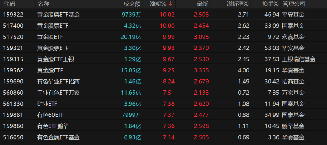 从1月28日ETF表现看,平安黄金股票ETF、国泰黄金股票ETF等均涨停,并出现2%以上的溢价率。此外,招商有色矿业ETF、万家工业有色ETF、国泰矿业ETF等涨幅也均超过7%。