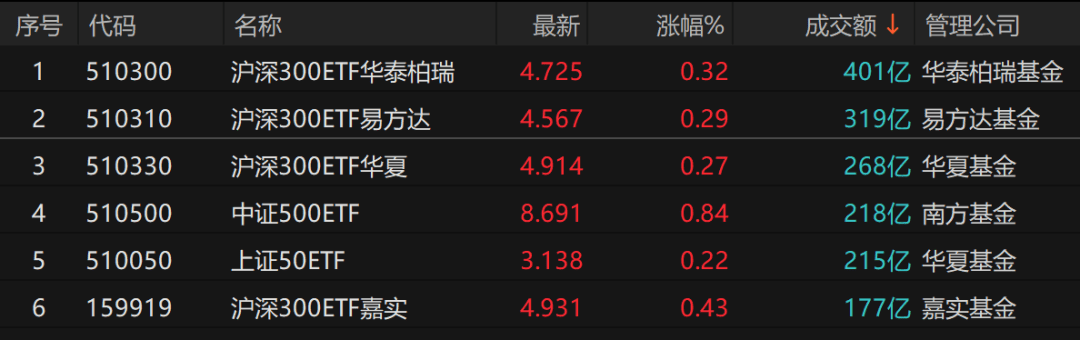 此外,易方达沪深300ETF成交额达到319亿元,华夏沪深300ETF成交额为268亿元,嘉实沪深300ETF成交额为177亿元,均创上市以来新高。
