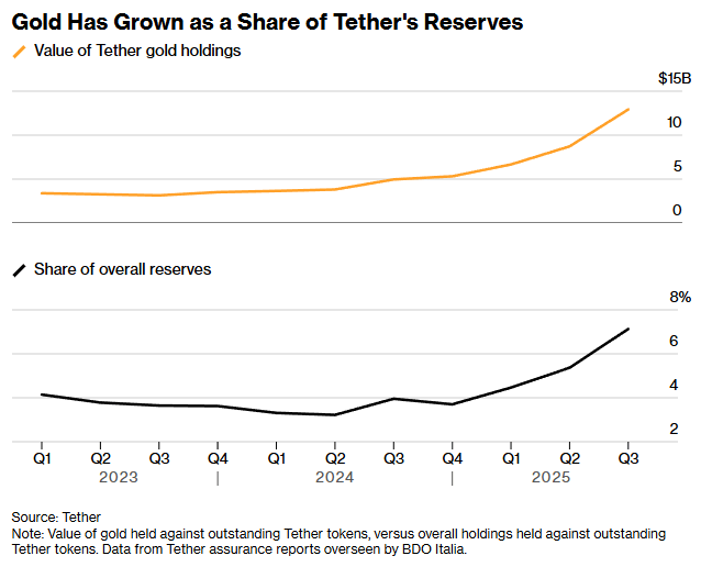 而且,这一规模仍在扩大。阿尔多伊诺称,Tether当前的购金速度约为每周一至两吨,并计划“至少在未来几个月内”持续这一节奏。他补充称:“当然,之后会根据市场情况再作决定,但我认为我们会继续沿着这个方向前进。”当被问及是否会在某个阶段减少购金时,阿尔多伊诺表示:“也许会减少,我们现在还不知道。我们将按季度评估对黄金的需求。”
