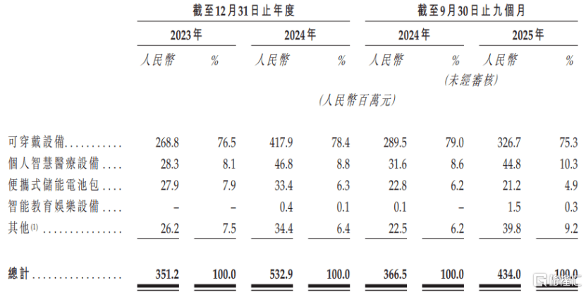 按产品应用场景产生的收入划分,2023年、2024年、2025年1-9月(简称“报告期”),公司75%以上的收入来自可穿戴设备领域,个人智慧医疗设备领域贡献了约10%的收入,便携式储能电池包、智能教育娱乐设备等业务收入占比很低。