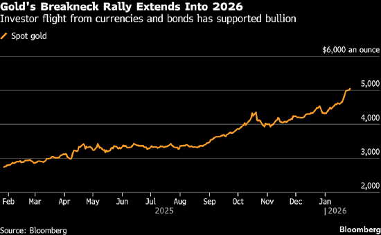 黄金价格持续走高,连续第二个交易日站稳每盎司5000美元关口。受美元走弱助推,叠加地缘政治风险升温、投资者大举撤离主权债券及主权货币,黄金此番凌厉涨势得以延续。