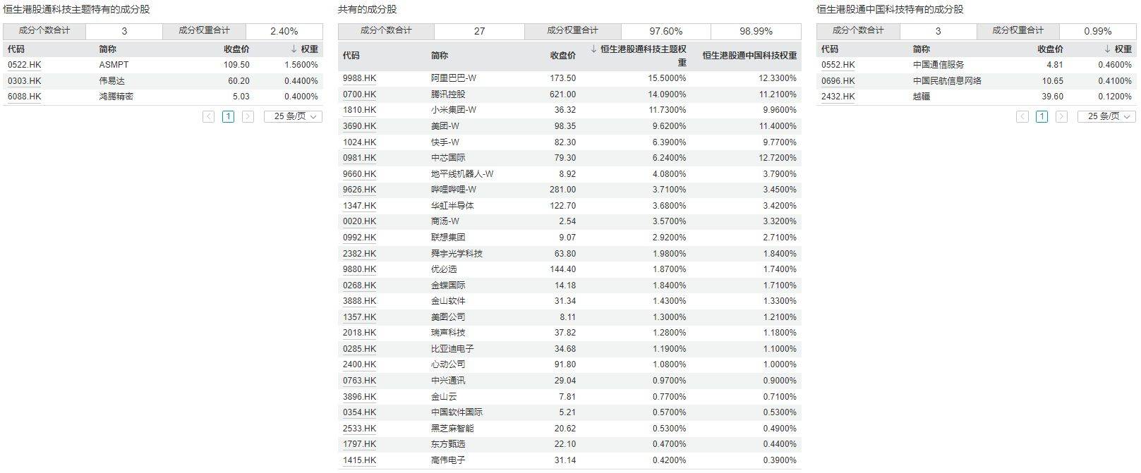 进一步对比两个指数的成分股,可以发现共同的成分股有27只,其中恒生港股通科技主题指数独有的成分股有3只,分别为ASMPT、伟易达和鸿腾精密,恒生港股通中国科技指数独有的成分股也是3只,分别为中国通信服务、中国民航信息网络和越疆。