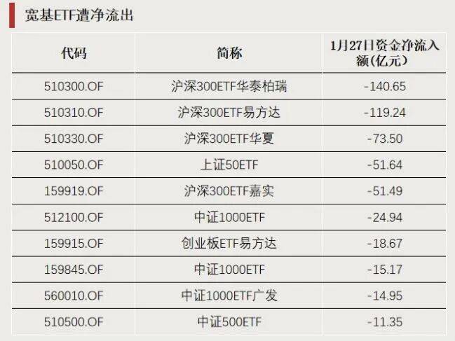 今日成交额居前的几只沪深300ETF近日遭遇资金净流出。1月27日,沪深300ETF华泰柏瑞和沪深300ETF易方达资金净流出额均超100亿元,沪深300ETF华夏和沪深300ETF嘉实资金净流出额均超50亿元。