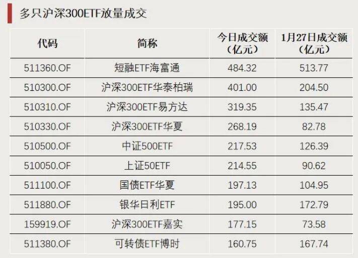 1月28日,截至收盘,ETF成交额合计5389.18亿元,较昨日成交额增长2239.14亿元;15只ETF成交额均突破100亿元。