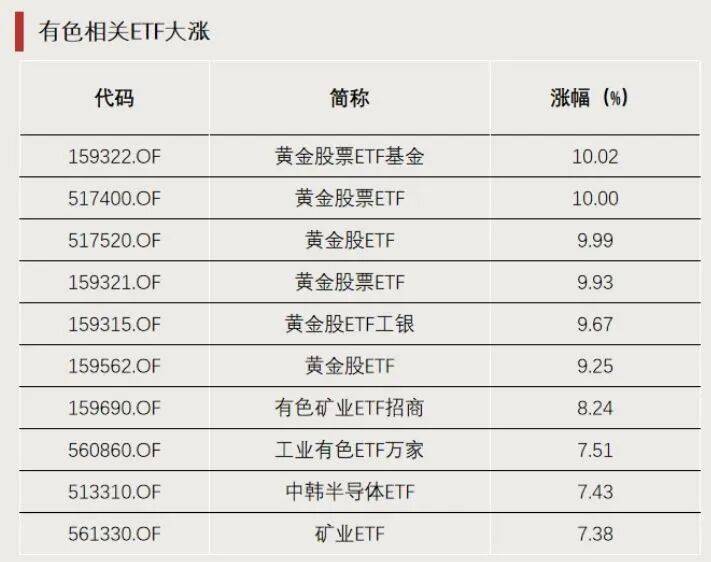 1月28日,资源股掀起涨停潮,带动有色相关ETF大涨。全市场ETF中,涨幅前十的ETF中有6只为黄金股相关ETF,其中3只黄金股相关ETF涨停。