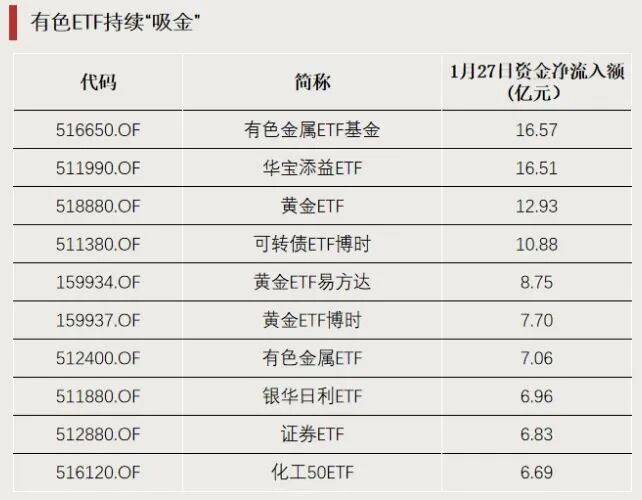 在有色板块强势行情带动下,有色相关ETF持续“吸金”,继1月26日资金净流入前十的ETF中出现了5只黄金、有色相关ETF后,1月27日,资金净流入前十的ETF中又出现5只黄金、有色相关ETF。