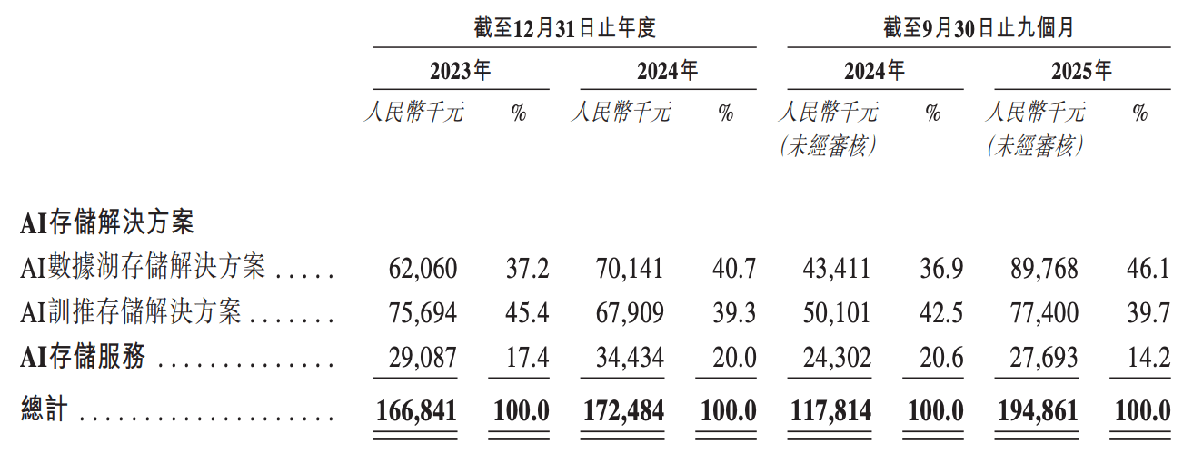AI存储解决方案是其主要收入来源,2023年、2024年、2025年前九个月的收入占比均接近或超过80%。