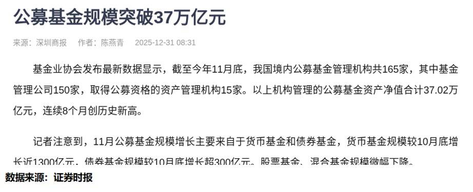 12月31日刷到证券时报的消息,说截至11月底咱们境内公募基金总规模到了37.02万亿,连续8个月破历史纪录了。好多朋友问我:“这规模涨了是不是说明市场要热起来?我手里的持仓会不会跟着涨?”别急,我用自己常年看的大数据思路给大家掰扯明白——规模数字是死的,机构大资金的真实动作才是活的,毕竟能影响咱们持仓的,从来不是“消息本身”,而是资金到底愿不愿意参与。
