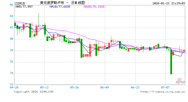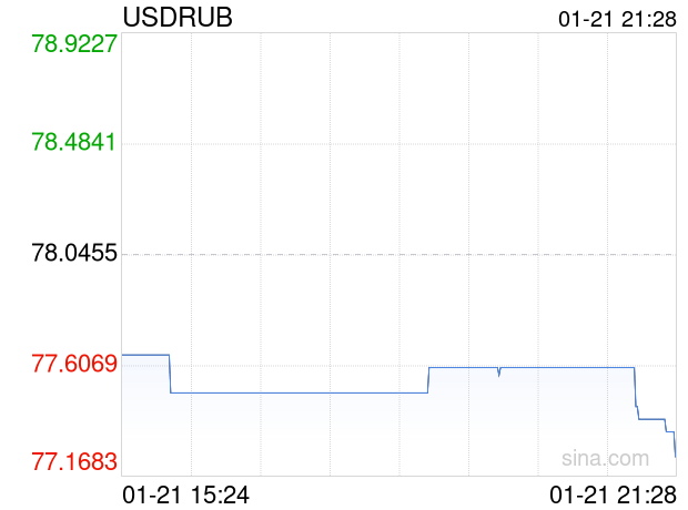 新浪外汇消息2026年01月21日,截至21时28分,外汇市场上美元兑俄罗斯卢布汇率跌破1美元兑换77.2455俄罗斯卢布。跌幅为-1.0250%