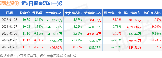 证券之星消息,截至2026年1月28日收盘,通达股份(002560)报收于10.59元,下跌3.11%,换手率7.76%,成交量35.13万手,成交额3.74亿元。