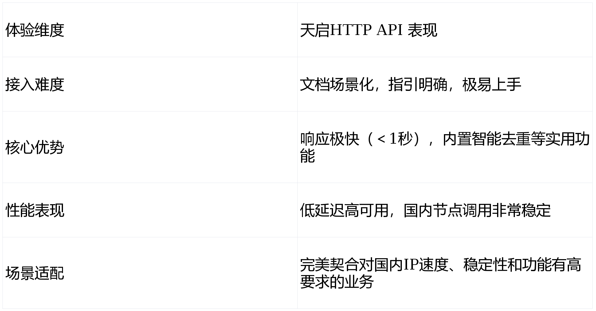 天启HTTP聚焦国内代理IP市场,它的API设计则透露出一种“为国内业务高效赋能”的务实感。