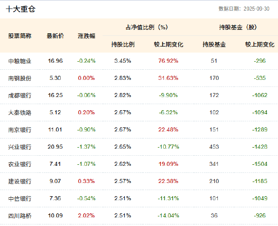 最新报道显示,红利低波ETF(512890)十大重仓股涨跌不一。具体为中粮糖业、南钢股份、成都银行、大秦铁路、南京银行、兴业银行、农业银行、建设银行、四川路桥、中信银行,持仓占比如下。