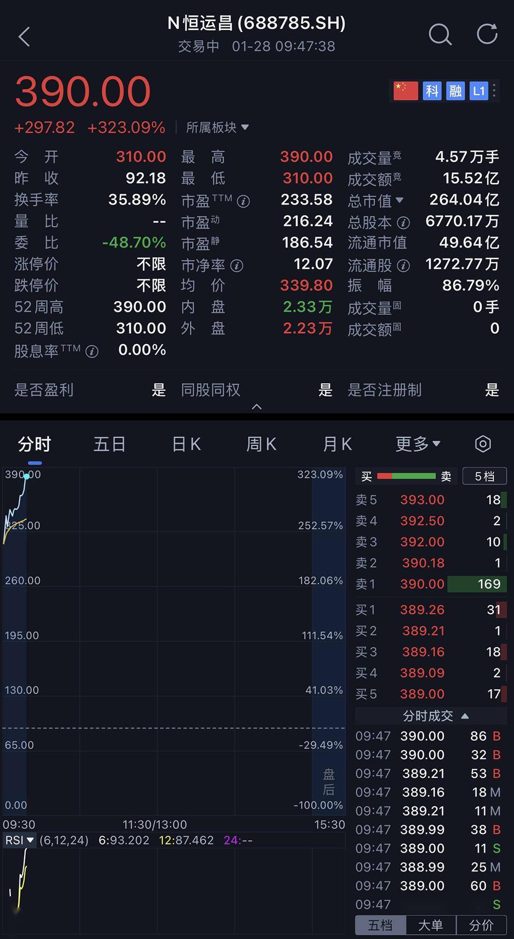 恒运昌发行价为92.18元/股,发行市盈率为48.39倍,开盘价为310元/股,涨幅达236%。截至9点50分,其股价最高上涨323%至390元/股,市值为264亿元。