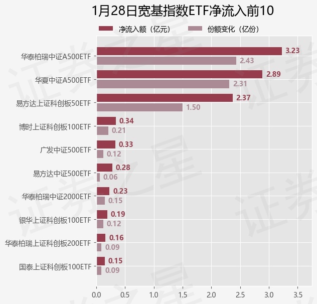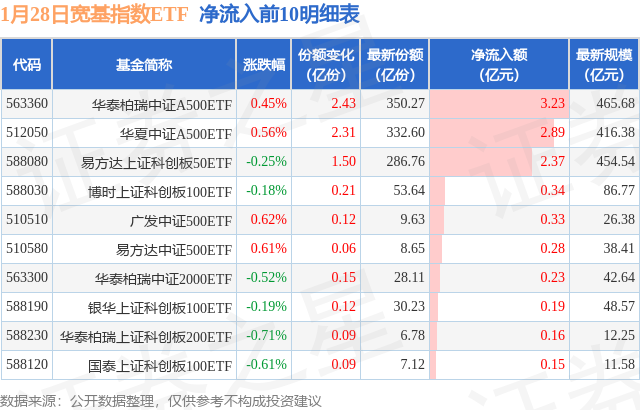 当日有27只宽基指数ETF基金出现资金净流入,其中净流入排首位的是华泰柏瑞中证A500ETF(563360),份额增加了2.43亿份,净流入额为3.23亿元。