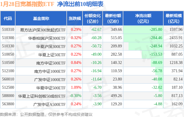 当日有68只宽基指数ETF基金出现资金净流出,其中净流出排首位的是易方达沪深300发起式ETF(510310),份额减少了62.67亿份,净流出额为285.8亿元。