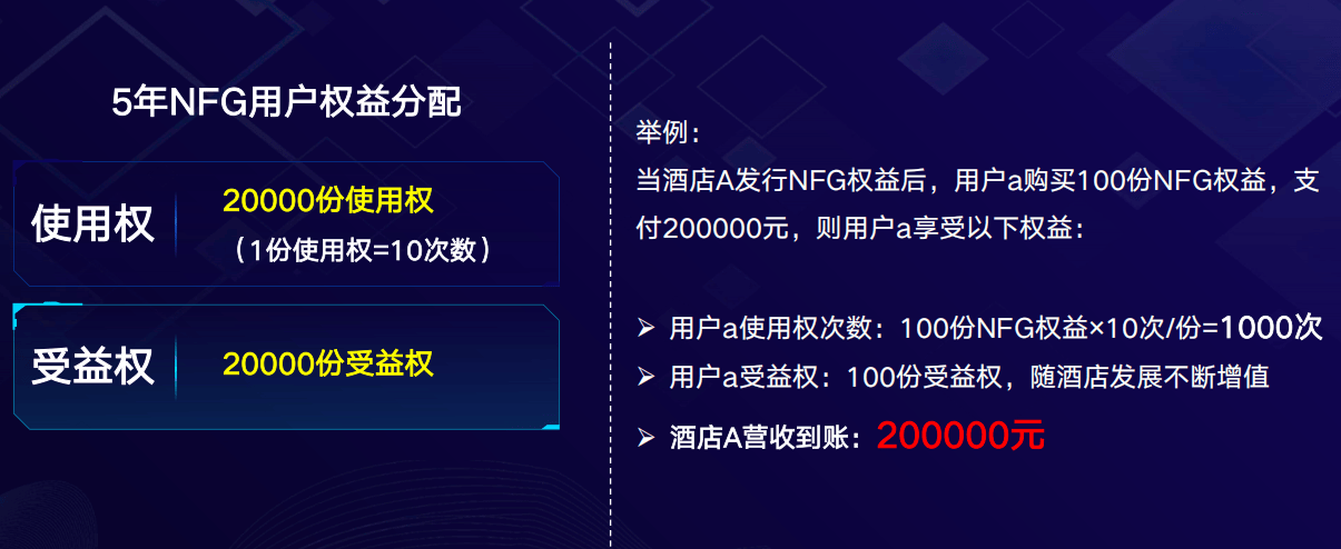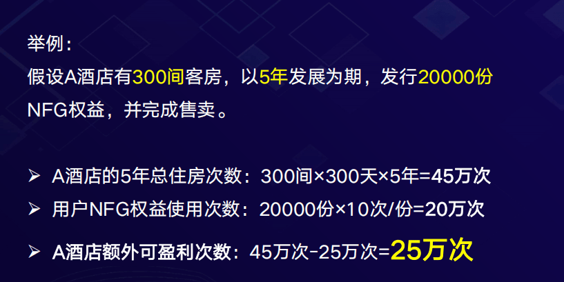 - 例如:一家300间房的酒店,发行2万份NFG,每份初始定价2000元。