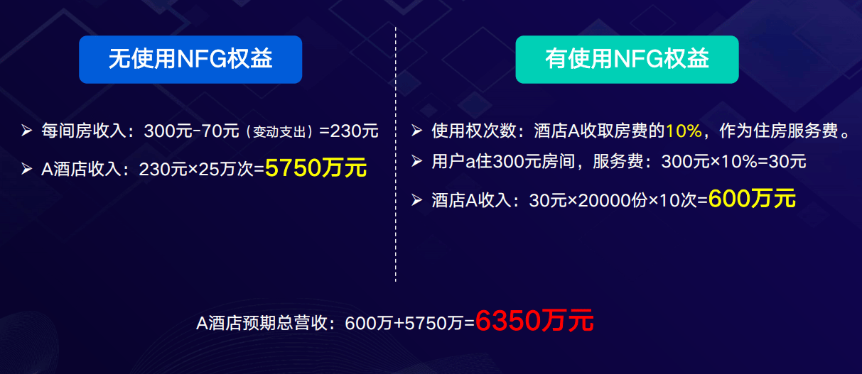 - 使用权:每份NFG包含固定次数的酒店住宿权益(如10次)。用户入住时,仅需支付房费的10%作为服务费给酒店。