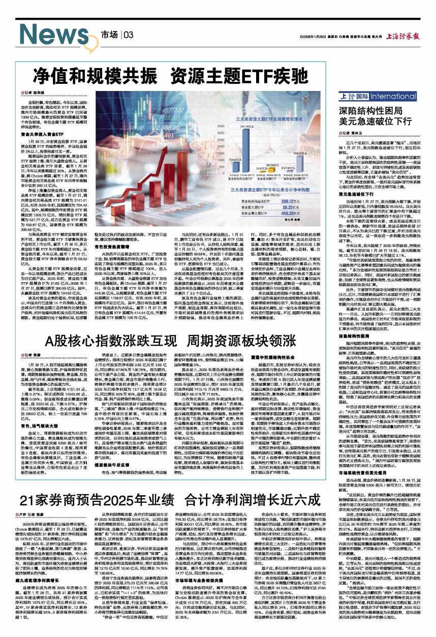张大伟 制图 ◎记者 赵明超 金银狂飙,有色潮起。今年以来,国际金价迭创新高,推动相关ETF规模劲增,境内市场规模最大的黄金ETF已突破1200亿元。随着金银投资热潮蔓延至整个有色领域,有色金属主题ETF规模同样快速增长。 资金大举流入黄金ETF 1月28日,平安黄金股票ETF、国泰黄金股票ETF均强势涨停,并且收盘溢价2%以上,投资热度可见一斑。 随着国际金价的屡创新高,黄金相关ETF强势上涨,吸引大量资金涌入。从黄金相关商品类ETF来看,截至1月28日,今年以来涨幅超过20%。从资金流向看,据Choice测算,截至1月27日,境内市场黄金相关商品类ETF年内净申购额合计达到289.12亿元。 净值上涨叠加资金涌入,黄金相关商品类ETF规模劲增。截至1月27日,境内黄金相关商品类ETF规模为3141.41亿元,而在2025年初,其规模仅为704.42亿元。其中,规模领跑的华安黄金ETF规模达到1205.72亿元,博时黄金ETF规模为521.77亿元,易方达黄金ETF规模为450.87亿元,国泰黄金ETF规模为390.58亿元。 与商品类黄金ETF锚定实物黄金有所不同,黄金股主题ETF主要聚焦黄金产业相关上市公司。截至1月28日,多只黄金股主题ETF年内涨幅超过50%。从资金流向看,今年以来,截至1月27日,黄金股主题ETF净申购额合计为59.22亿元。 从黄金股主题ETF规模变动看,过去一年以来规模劲增,部分产品已经成长为百亿级产品。2025年初,黄金股主题ETF规模合计为21.65亿元;2026年1月27日,规模已增至290.99亿元。其中,永赢黄金股ETF规模为194.63亿元。 谈及对黄金走势的看法,华安基金表示,中国央行已连续14个月净购入黄金,全球央行的购金潮正是持续优化储备资产结构、对冲地缘风险和美元信用风险的缩影。黄金短期仍处于强势区间,但须警惕交易过热后的波动加剧风险,不宜盲目追高,建议坚持稳健配置理念。 有色投资热度骤增 火热的不只是黄金相关ETF。广泛投资于金、铜、铝等资源品的有色金属主题ETF也实现了净值与规模的双重共振。2025年,多只有色金属主题ETF涨幅超过100%,进入2026年以来,再度强势上涨30%以上。 从资金流向看,大量资金借道ETF加仓有色金属板块。据Choice测算,截至1月27日,有色金属主题ETF年内净申购额为448.28亿元。从规模来看,有色金属主题ETF总规模达1158.97亿元,而在2025年初,其规模尚不足百亿元。其中,部分有色金属主题ETF快速成长为大块头。截至1月27日,南方有色金属ETF规模为414.44亿元,华夏有色金属ETF规模为198.76亿元。 与此同时,还有众多新品推出。1月21日,鹏华工业有色ETF成立,该ETF已发布上市交易公告书,从持有人结构来看,截至1月22日,个人投资者持有的份额占基金总份额的99.68%,并且前十名场内基金份额持有人均为个人投资者。另外,泰康有色ETF、景顺有色ETF也已成立。 从基金配置情况看,过去几个月来,主动权益类基金经理对有色板块关注度显著升温。中金公司根据公募基金2025年四季报测算的数据显示,2025年四季度末公募基金在有色金属板块的持仓比例,较三季度末提升了2.3个百分点。 谈及有色金属行业强势上涨的原因,银河基金经理金烨发文表示,当前海外地产周期、制造业周期、库存周期均处低位,市场对美联储降息后的海外传统需求回升预期较强,推动有色金属商品价格上行。同时,多个有色金属品种供给扰动频繁,叠加AI资本开支扩张,由此拉动电力设施、储能等领域的需求,进而拉动上游金属材料的需求预期,核心是铜、锡、白银、锂等金属品种。 在接受上海证券报记者采访时,万家双引擎灵活配置混合基金经理叶勇表示:作为全球定价品种,工业金属和小金属过去两年来价格持续抬升,在全球定价体系下基本面稳健向好,投资逻辑顺畅;未来又叠加国内宏观经济回升预期,逻辑进一步强化,有望实现盈利提升与估值拔升共振。 在长城基金经理陈子扬看来,本轮有色金属行业的高盈利状态或将维持较长周期,在新增需求持续拉动下,有色金属板块已逐渐具备成长属性,这一变化本身就值得市场对其进行重新估值。不过,短期内对铜、铝品种持谨慎态度。