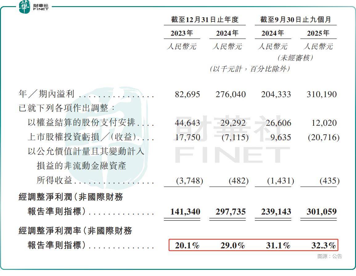 另外,2023年、2024年及2025年前三季度,公司的经调整净利润率分别为20.1%、29.0%、32.3%。