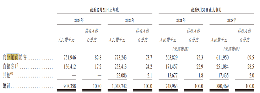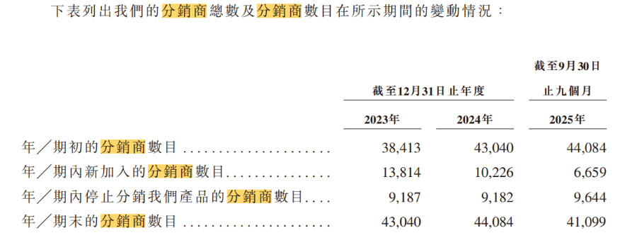 2023年、2024年、2025年前三季度,沃客非凡来自前五大客户的收入分别占当期总收入的比例分别为4.2%、6.4%和5.1%。另外值得注意的是,沃客非凡的分销商规模比较小。2024年,该公司来自44084个分销商的收入合计7.73亿元,平均每个分销商每年的销售额约为1.75万元。
