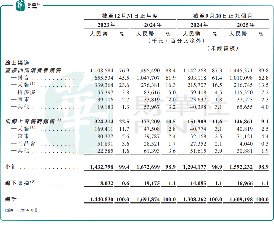 最突出的隐患是渠道上的“单腿走路”。接近99%的收入依赖线上直接销售,其中抖音一家独大,使公司的经营命脉与单一平台的生态深度绑定。在兴趣电商领域,平台规则、算法和流量成本的任何风吹草动,都可能对公司造成直接冲击。