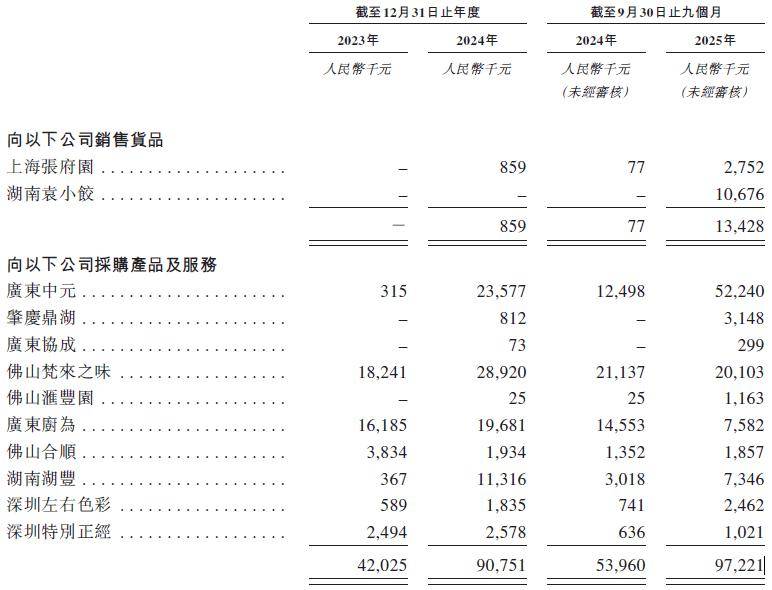 招股书披露,2023年至2025年前三季度,袁记食品向关联方采购产品及服务的总额从4202.5万元暴增至9722.1万元,累计增幅高达131%。尤为关键的是,这些关联交易高度集中于创始人妻子所控制或施加重大影响的企业。