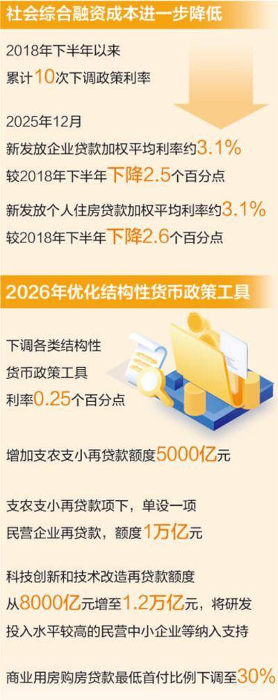 2026年,人民银行从两方面着手优化结构性货币政策工具,加快助力结构转型优化。一方面,下调各类结构性货币政策工具利率0.25个百分点,各类再贷款一年期利率从目前的1.5%下调到1.25%,提高银行重点领域信贷投放的积极性。