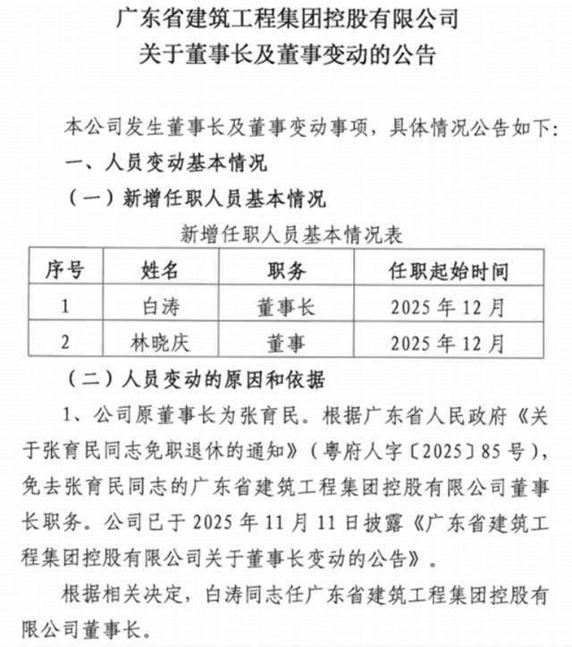 乐居财经 赵盼盼近日,广东省建筑工程集团控股有限公司(以下简称“广东建工控股”)公告,白涛正式出任公司董事长。目前,公司官网已更新。