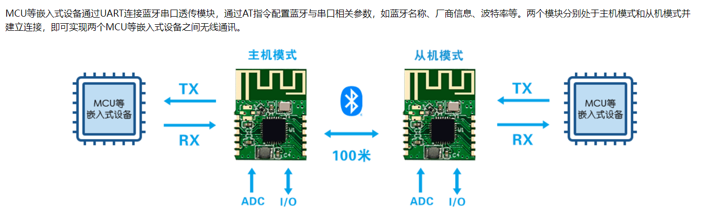 两套嵌入式系统可分别连接BLE-TPT蓝牙透传模块,并配置为一主一从模式。模块间建立蓝牙连接后,即可实现两个设备间的全双工无线数据透传,无需更改原有串口协议,大幅简化了双机无线通信的开发流程。