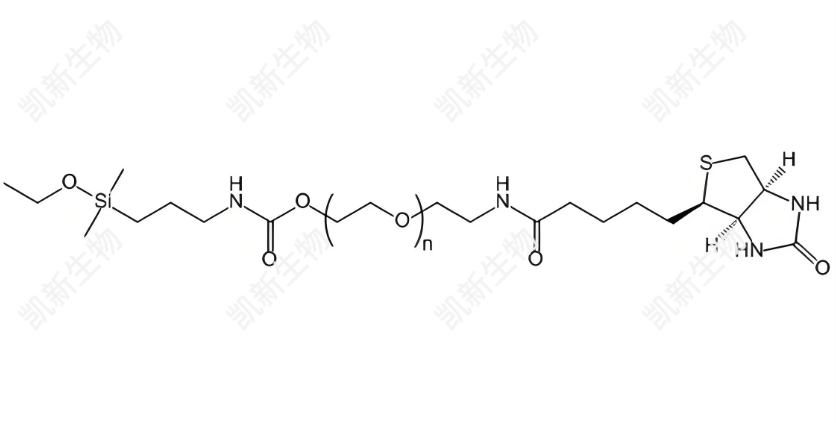 功能基团:一端为单乙氧基硅烷基团,另一端为生物素,中间通过PEG链连接。PEG链的长度(分子量)可定制,常见规格包括2000 Da、3400 Da、5000 Da等。