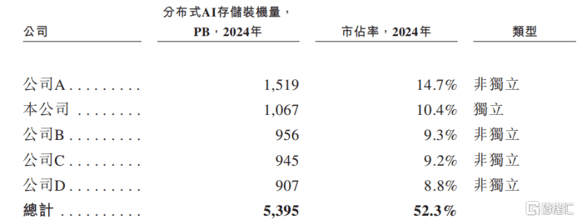 根据灼识咨询的资料,按2024年装机量计,中国前五大分布式AI存储解决方案提供商合计市占率为52.3%,而星辰天合占市场的10.4%,是中国第二大的分布式AI存储解决方案提供商,及最大的独立分布式AI存储解决方案提供商。