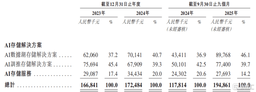 按业务类别划分,2023年至2025年1-9月,AI数据湖存储解决方案在公司收入中的占比由37.2%提升至46.1%,AI训推存储解决方案的收入占比由45.4%下降至39.7%。