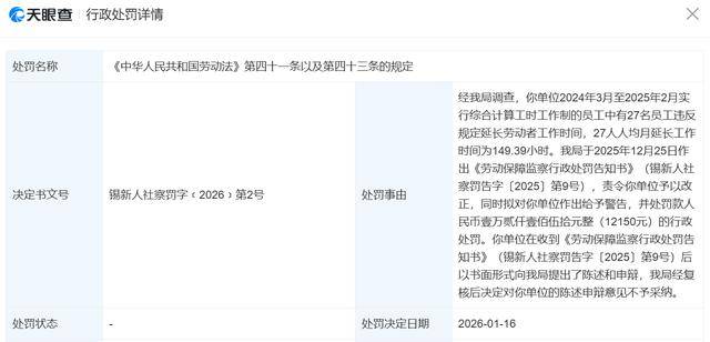 据天眼查网站,近日,无锡当当网信息技术有限公司因违反劳动法被罚款12150元。经无锡市新吴区人力资源和社会保障局调查,该公司2024年3月至2025年2月实行综合计算工时工作制的员工中有27名员工违反规定延长劳动者工作时间,27人人均月延长工作时间为149.39小时。