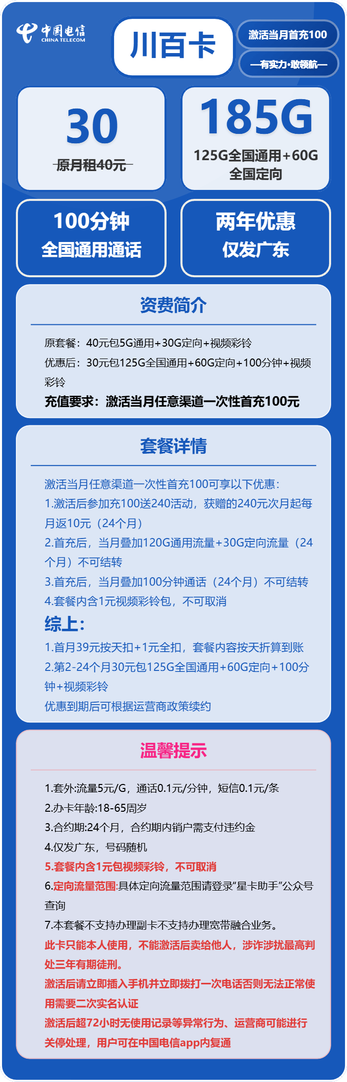 这款电信川百卡是广东地区专属套餐,套餐归属地为广东,仅支持广东省内发货,精准服务本地用户群体。