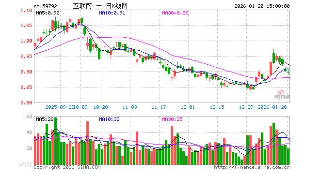 1月20日,港股通互联网ETF(159792)跌0.55%,成交额17.93亿元。当日份额减少100.00万份,最新份额为998.41亿份,近20个交易日份额增加61.60亿份。最新资产净值计算值为894.27亿元。