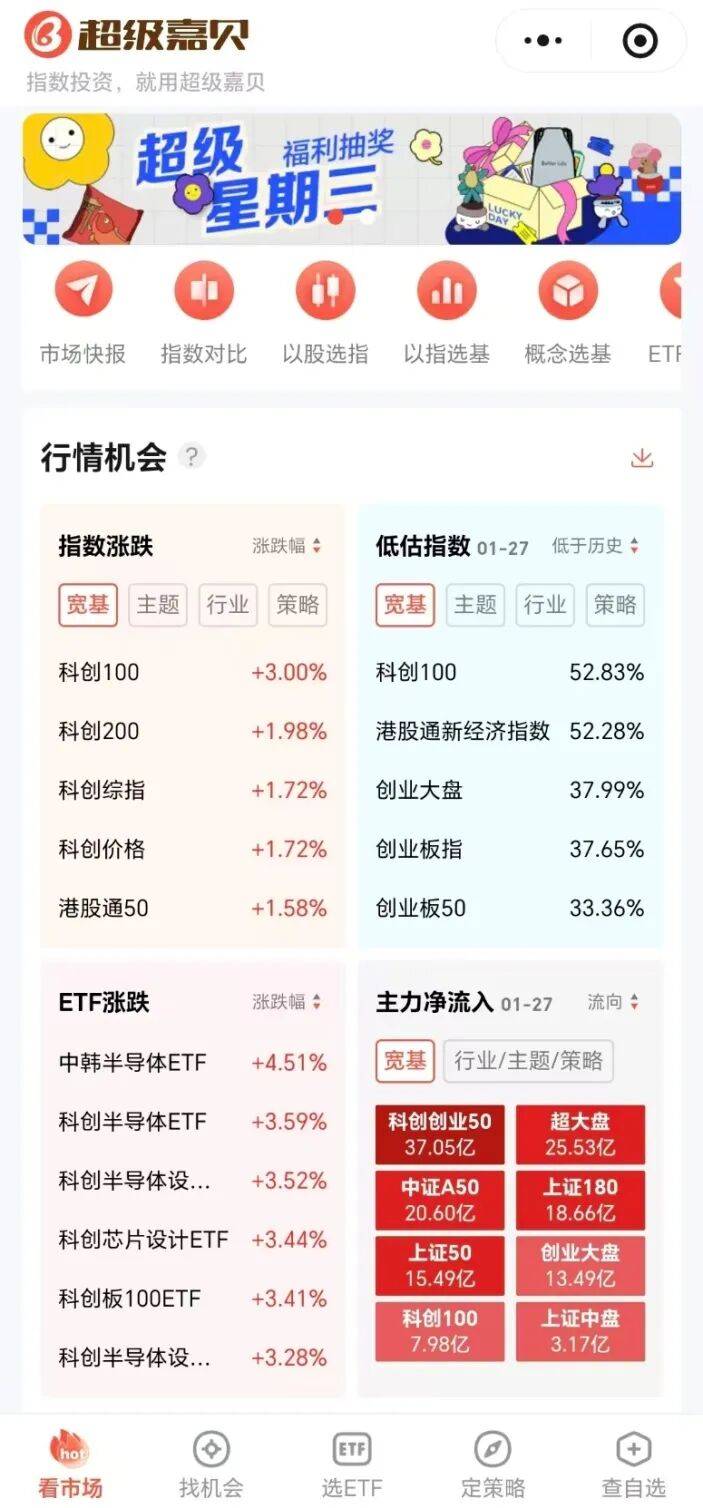 与此同时,嘉实基金还推出“超级嘉贝”指数投资小程序,整合指数工具、行情热点、投教内容等功能。投资者只需要登录小程序,就可以对当前行情变动一目了然,并可以根据自己的投资需求筛选更趁手的ETF。