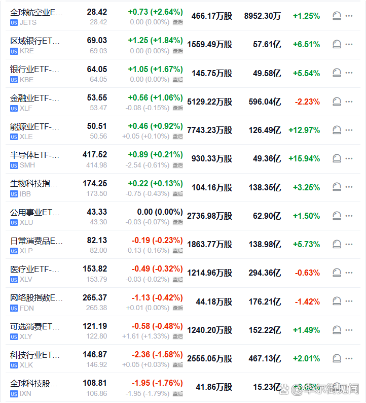 【航空业ETF收涨超2.6%,领跑美股行业ETF,标普科技板块跌超1.8%】周四(1月29日)),全球航空业ETF收涨2.64%,区域银行ETF、银行业ETF至多涨1.84%,能源业ETF涨0.92%,半导体ETF涨0.21%,网络股指数ETF、可选消费ETF至多跌0.48%,科技行业ET...