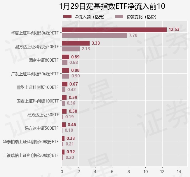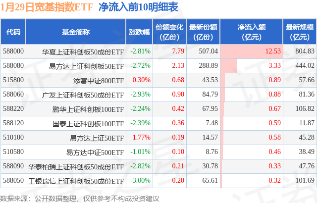 当日有50只宽基指数ETF基金出现资金净流入,其中净流入排首位的是华夏上证科创板50成份ETF(588000),份额增加了7.79亿份,净流入额为12.53亿元。