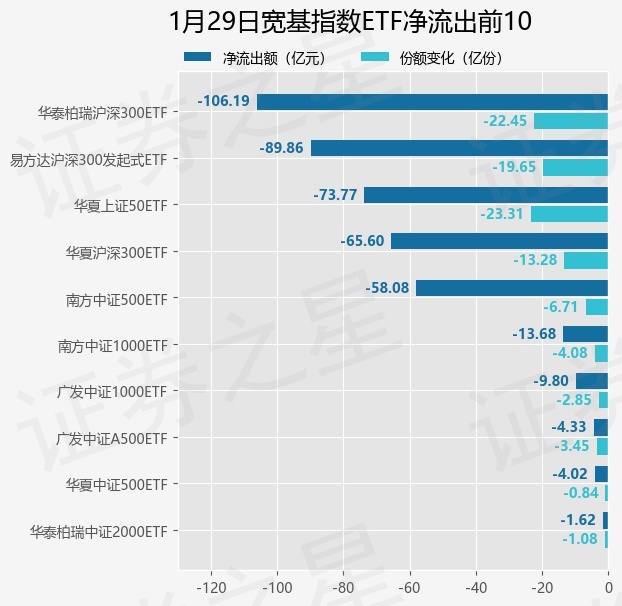当日有55只宽基指数ETF基金出现资金净流出,其中净流出排首位的是华泰柏瑞沪深300ETF(510300),份额减少了22.45亿份,净流出额为106.19亿元。