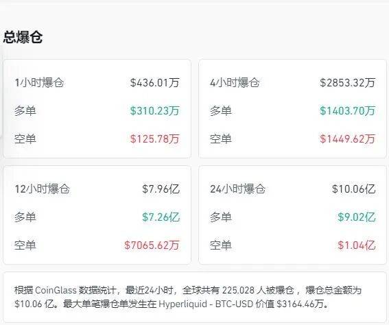 coinglass数据显示,24小时加密货币全网共有超22万人爆仓,10.06亿美元(约合人民币70亿元)灰飞烟灭。