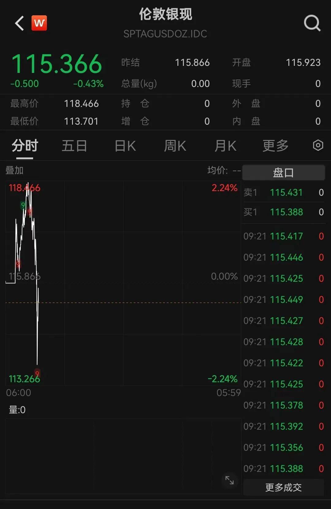现货白银跌至115.366美元/盎司,日内跌0.43%。