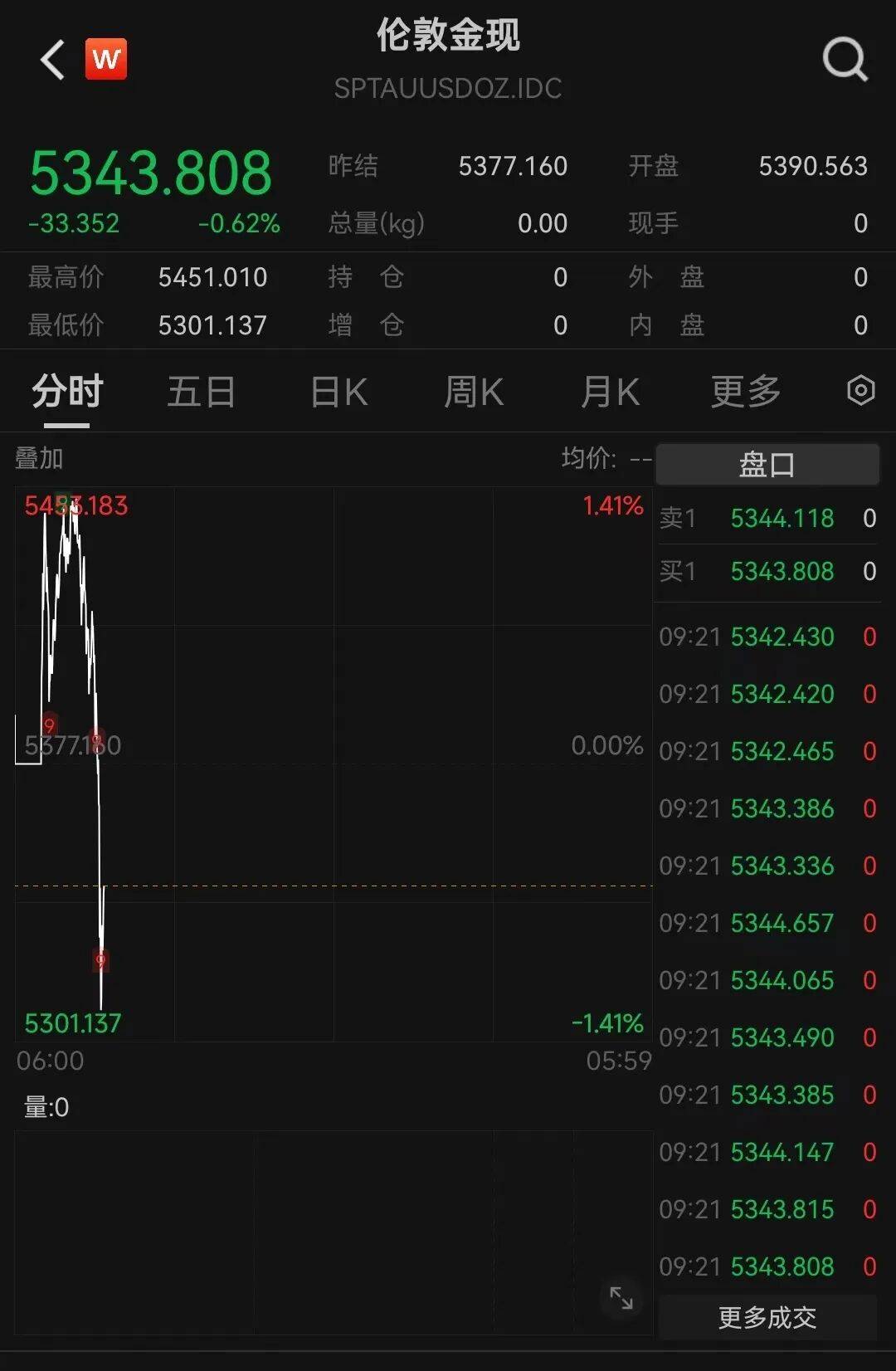29日,现货黄金最高触及5598.75美元的历史高点,深夜盘中一度大跌5.9%,最低时报5097.36美元/盎司,现货白银一度大跌8.4%,最低报106.76美元/盎司。随后黄金、白银强势反弹,收复近半跌幅。30日盘中再度跳水,截至发稿,现货黄金跌至5343.808美元/盎司,日内跌0.62%。