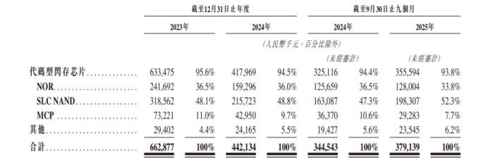 根据招股书,近年来芯天下代码型闪存芯片收入占比和超过90%。2025年1-9月,公司NOR、SLC NAND及MCP产品收入占比分别为33.8%、52.3%、7.7%。