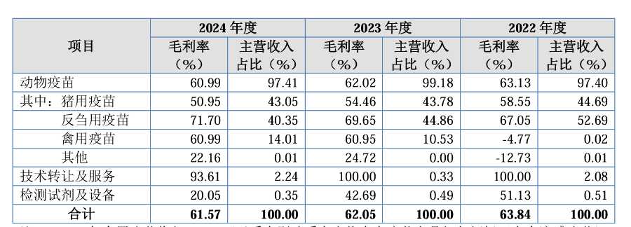 公司称,2023年主营业务毛利率较上年下降1.79个百分点,2024年公司主营业务毛利率较上年下降0.47个百分点,主要原因系猪用疫苗市场竞争激烈,毛利率受销售单价持续下降影响呈下降趋势;产品结构有一定变动,毛利率较高的反刍用疫苗收入占比有所下降,毛利率较低的禽用疫苗收入占比有所上升,拉低了主营业务毛利率。