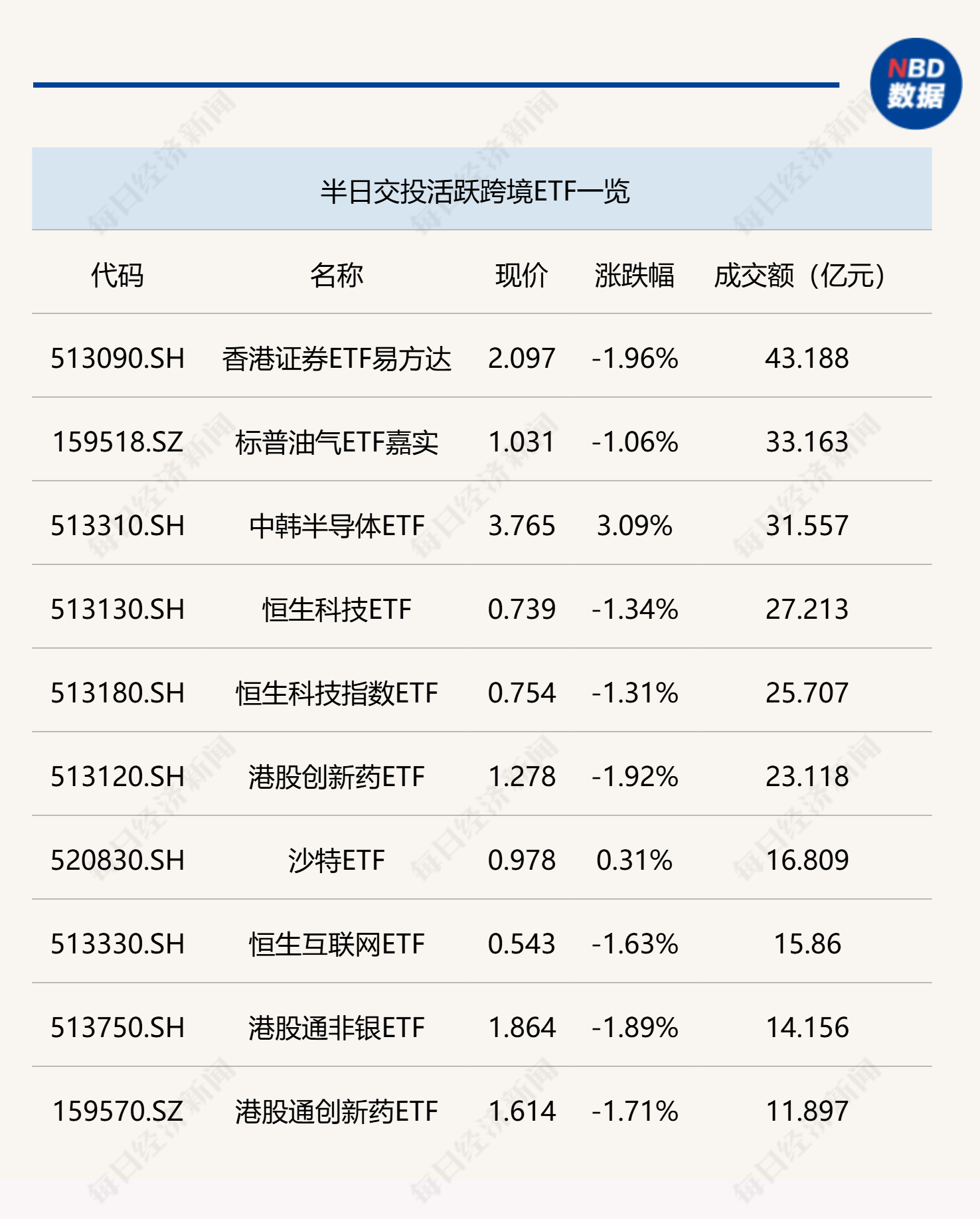 行业主题ETF方面,有色金属ETF(512400)半日成交金额高达45.16亿元,科创芯片ETF(588200)、酒ETF(512690)半日成交金额超20亿元。跨境ETF方面,香港证券ETF易方达(513090)半日成交金额达到43.19亿元。