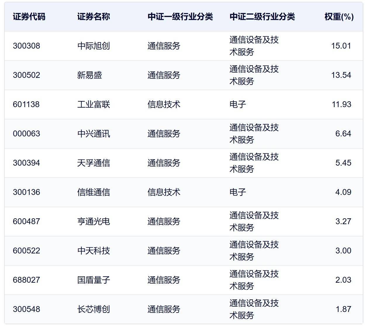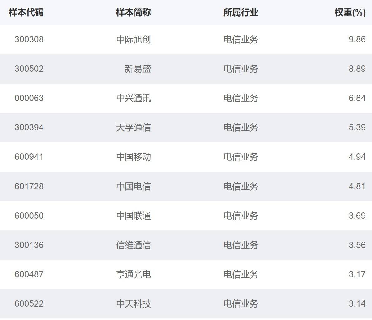 国证通信指数主要权重股
