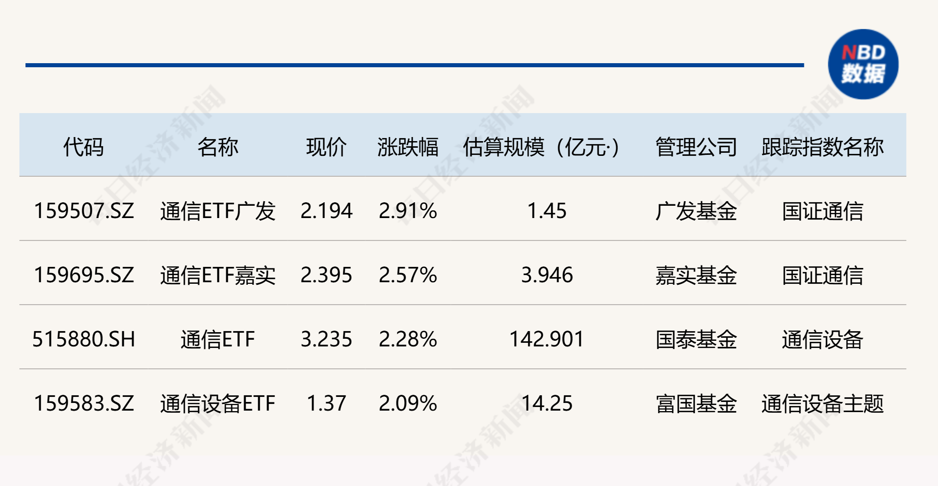 点评:通信ETF广发(159507)早盘大涨近3%,该产品规模约1.45亿元,跟踪标的指数为国证通信指数,跟踪上述指数的产品还有通信ETF嘉实(159695)。