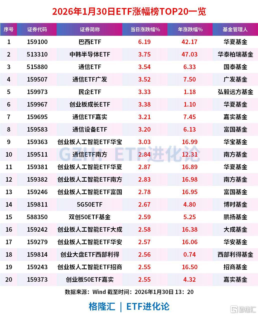 ETF方面,通信ETF、通信ETF广发、创业板成长ETF、通信ETF嘉实、通信设备ETF、创业板人工智能ETF华宝、通信ETF南方、创业板人工智能ETF华夏、创业板人工智能ETF南方、创业板人工智能ETF富国分别涨3.54%、3.52%、3.38%、3.21%、3.20%、3.03%、2.84%、2.87%、2.83%、2.78%。