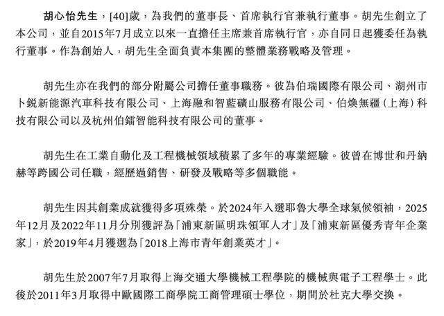胡心怡亦在公司的部分附属公司担任董事职务。其为伯瑞国际有限公司、湖州市卜锐新能源汽车科技有限公司、上海融和智蓝矿山服务有限公司、伯焕无疆(上海)科技有限公司以及杭州伯镭智能科技有限公司的董事。